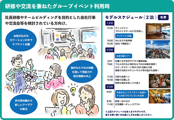 Spring - Autumn: Fishing or cruising on a fishing boat Winter: Production experience tour (oyster farming, wakame harvesting, red clam harvesting, clam farming) Evening - Visit a nearby day spa