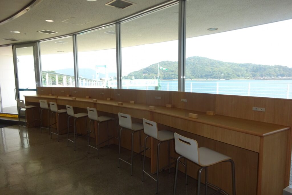 The second floor of the Toba Ferry Terminal, where the Ise Bay Ferry, a marine bypass on Route 42 connecting Toba City in Mie Prefecture and Cape Irago in Tahara City, Aichi Prefecture, arrives and departs, is equipped with free Wi-Fi. The second floor of the Toba Ferry Terminal, where the Ise Bay Ferry arrives and departs on the National Route 42 sea bypass, is equipped with free Wi-Fi, and there is an observation counter with a power supply for charging smartphones and mobile PCs, as well as a Japanese-style room, which anyone can use to relax and enjoy the view of Toba Bay. The hotel is also equipped with a hall that provides meeting and working space for a fee.