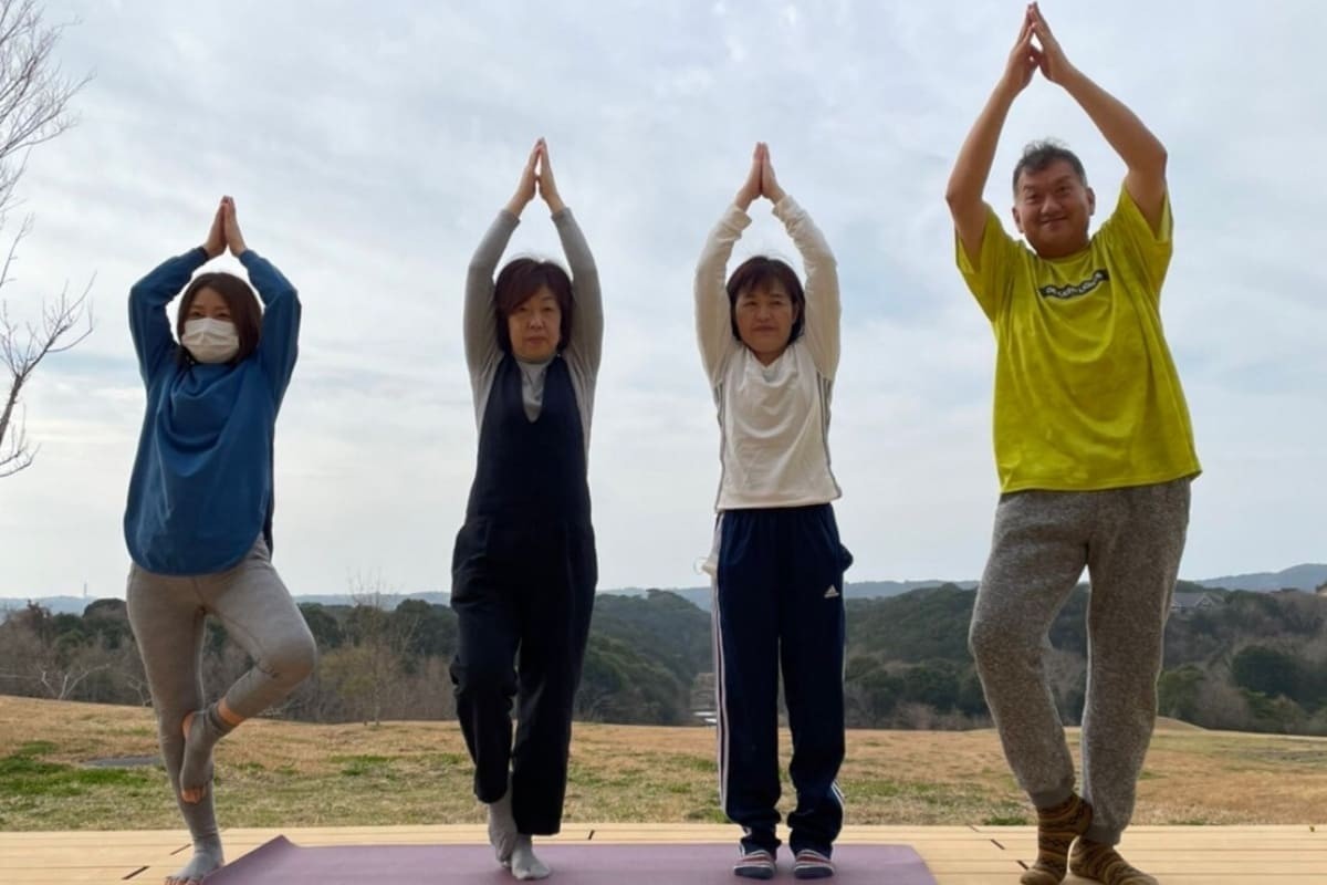 2日目の朝は朝Rela(ヨガプログラム)からスタート。屋内にも利用スペースがありますが、天気の良い日は野外がオススメ。たまたま知人が居たとのことで、4人でヨガポーズ。